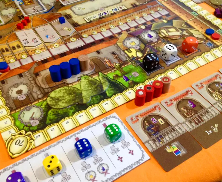 《辉煌的洛伦佐》结合了掷骰、可变玩家能力、工人放置等机制,游戏中还有一个特别的系统:每两轮玩家都可以将一定的信仰清零,去教会做一次礼拜,来避免遭受惩罚。